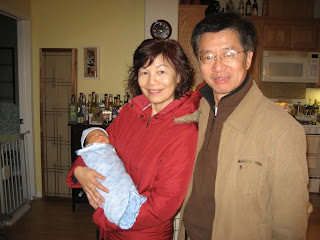 My parents were a little disappointed when they had expected CJ to arrive close to Xmas time, which my mom would not be able to get time off for. But since he arrived 2 weeks earlier, they were both very excited to be able to come and visit their first grandson. They came to the bay area to visit 4 days after CJ was born. First thing they did when they walked in the door was ask where their grandson was, asked to hold him, and immediately tookk this picture!